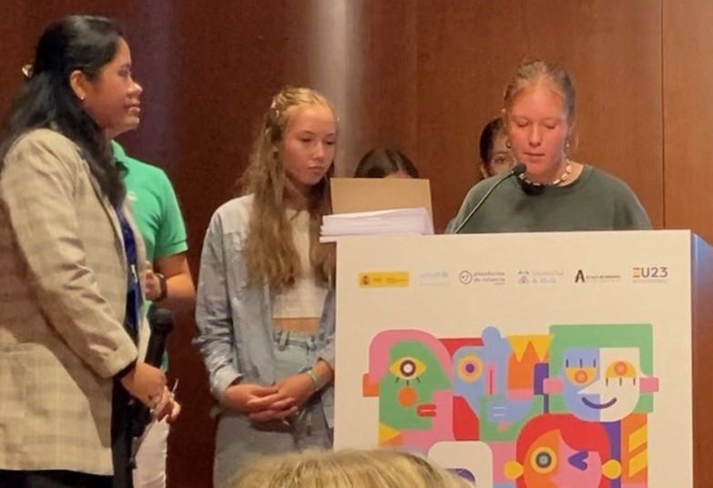 Alcalá de Henares, Španělsko, 29. a 30. září a 1. října. Španělské předsednictví EU se ve svém závazku podporovat participaci dětí a dospívajících na různých úrovních zavázalo k většímu důrazu na participační právo dětí v rozhodovacích procesech EU. Proto španělská vláda během svého předsednictví učinila z participace dětí a mladých dospělých prioritu v naději, že inspiruje další evropské vlády k následování. Za tímto účelem bylo zorganizováno setkání ve spolupráci s UNICEF Španělsko a Platformou dětských organizací dětí z celé Evropy. Českou republiku na akci reprezentovala odvážná dvojice Magdalena Knopová (16) a Anna Koubová (14). Podmínkou osobní účasti na setkání nazvaném „Face to face“ v Alcalá de Henares byla pravidelná účast na on-line metodických setkáních, tzv. dětské poradní skupině, která probíhala v průběhu měsíců červenec-září 2023. V poradní skupině děti spolupracovaly na identifikaci hlavních témat a tvorbě průzkumu. Všechny jednání probíhaly v anglickém jazyce.