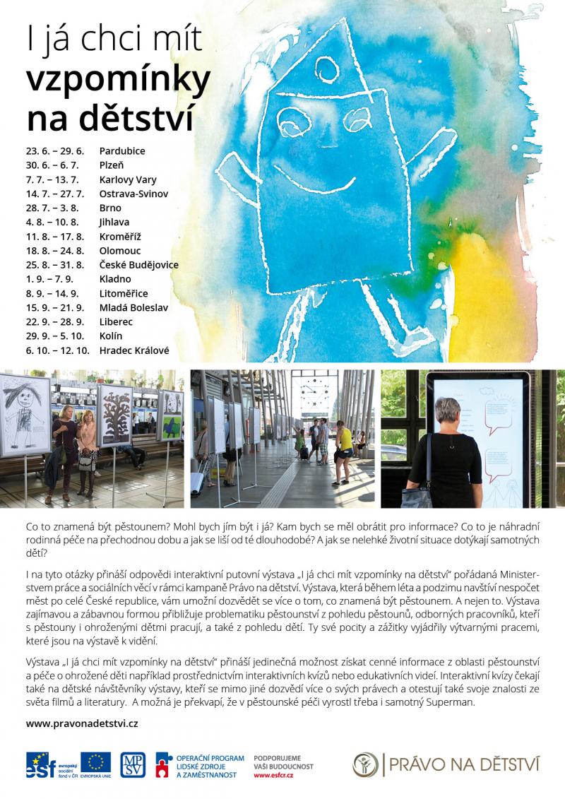Putovní interaktivní výstava „I já chci mít vzpomínky na dětství umožňuje široké veřejnosti dozvědět se více o tom, co znamená být pěstounem. A nejen to – zajímavou a zábavnou formou přibližuje problematiku pěstounství z pohledu pěstounů, odborných pracovníků, kteří s pěstouny i ohroženými dětmi pracují, a také z pohledu dětí. Ty své pocity a zážitky vyjádřily výtvarnými pracemi, které jsou na výstavě k vidění.