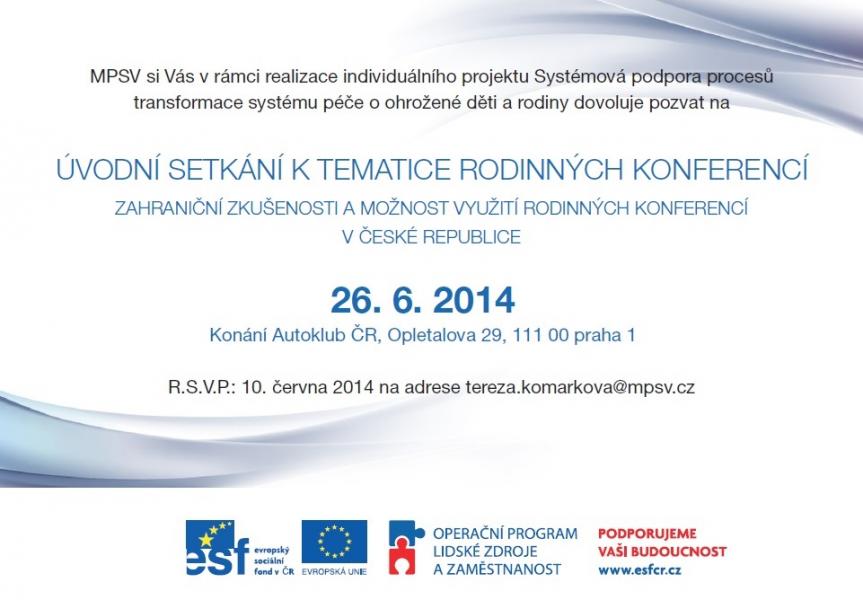 Úvodní setkání k tematice rodinných konferencí se uskuteční dne 26. června 2014 v Praze, v Autoklubu ČR, ul. Opletalova 29, od 10 do 16 hod. Účast na semináři není zpoplatněna a pro účastníky je zajištěno celodenní stravování. Pro část účastníků je možné z prostředků individuálního projektu zajistit rovněž ubytování v místě konání úvodního setkání.