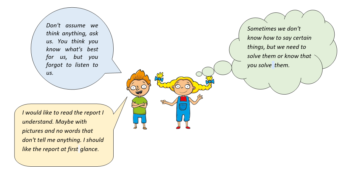 And what would children want to tell the adults? „Do not assume we think anything, ask us. You think you know what the best for us is, but you forgot to listen to us. Talk to us and explain things, to us clearly. “