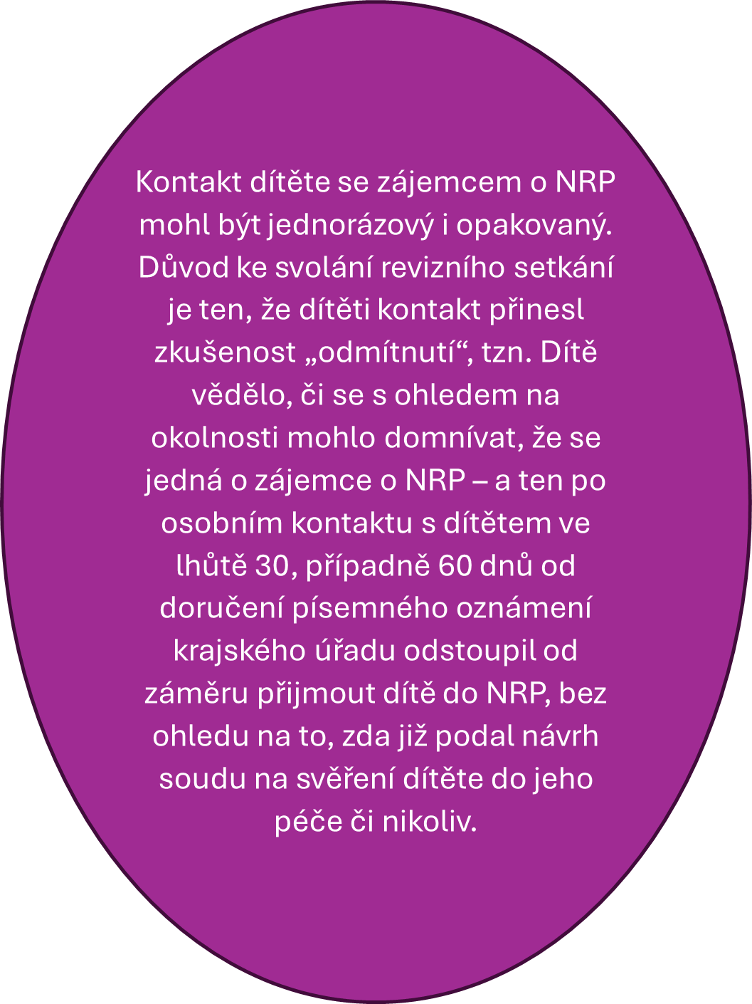 - Jako vhodné se jeví revizní setkání svolat nejdříve cca 1 měsíc od ukončení seznamování s dítětem/po ukončení pobytu dítěte v NRP; a to z důvodu opadnutí prvotních emocí účastníků, získání většího nadhledu všech zúčastněných stran a následně jejich ochoty o dané situaci otevřeně hovořit.